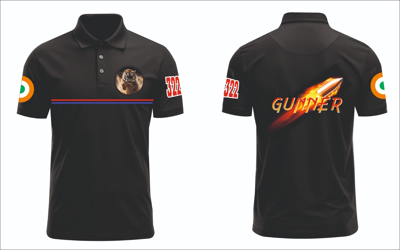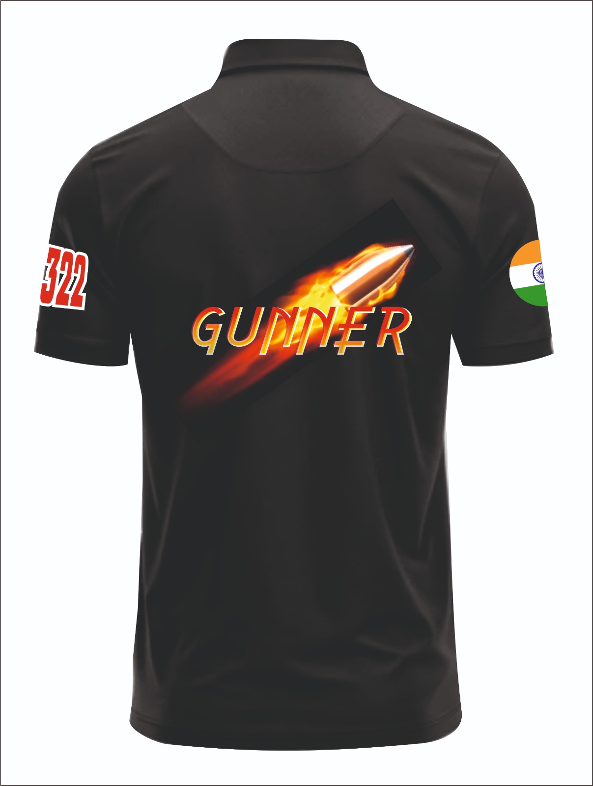 The front features a striking tiger emblem along with clean stripe detailing and sleeve numbering, reflecting strength and discipline. The back showcases a powerful “GUNNER” graphic with a dynamic bullet design, giving it a commanding and personalized touch. Additional flag elements on the sleeves further enhance its military-inspired identity.