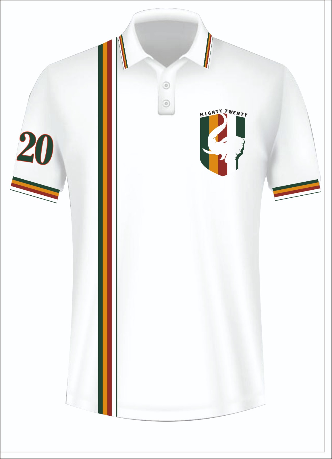 Featuring a classic polo neck with button closure, it offers a structured and refined appearance. The design highlights a striking vertical multi-color stripe pattern, adding a modern and dynamic touch. The chest features the distinctive “Mighty Twenty” emblem, while the sleeve showcases a bold number print, enhancing its identity and sporty appeal.